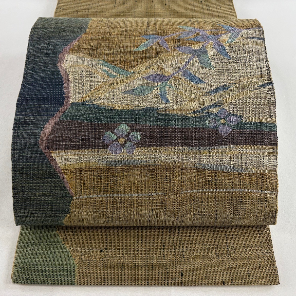 > 袋帯 美品 秀品 草花 霞 ラメ糸 山吹茶色 お太鼓柄 正絹 【中古】