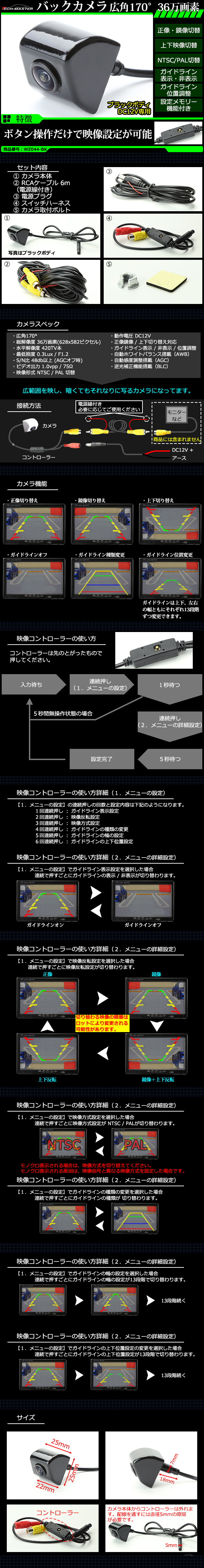 - 車両用 バックカメラ 広角170度 36万画素 ボタン操作 正像 鏡像 上下反転 NTSC/PAL ガイドライン 位置調整可能 DC12V ブラック WZ044-BK