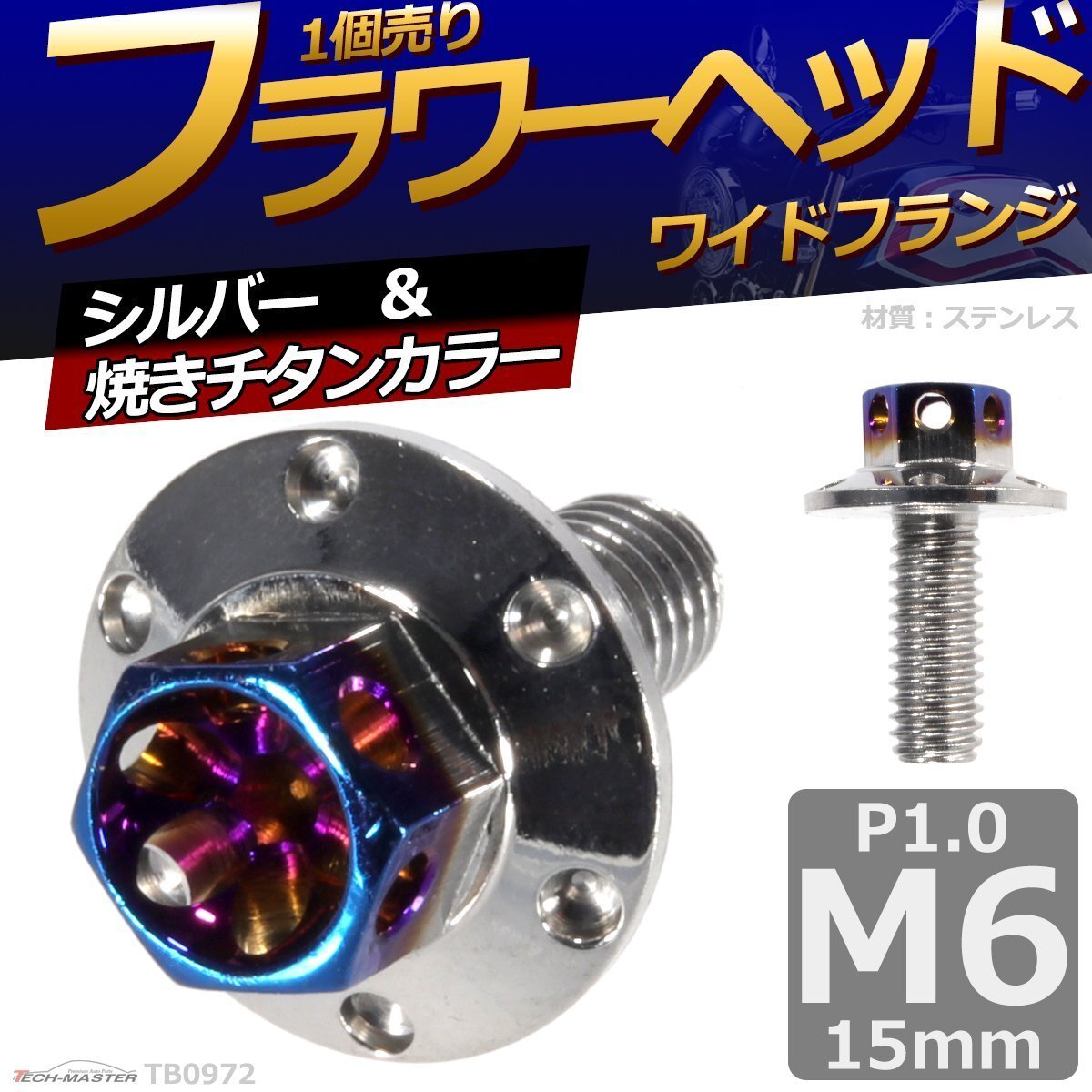 > M6×15mm P1.0 フラワーヘッド ワイドフランジ 六角ボルト ステンレス 車/バイク ドレスアップ シルバー&焼きチタンカラー 1個 TB0972
