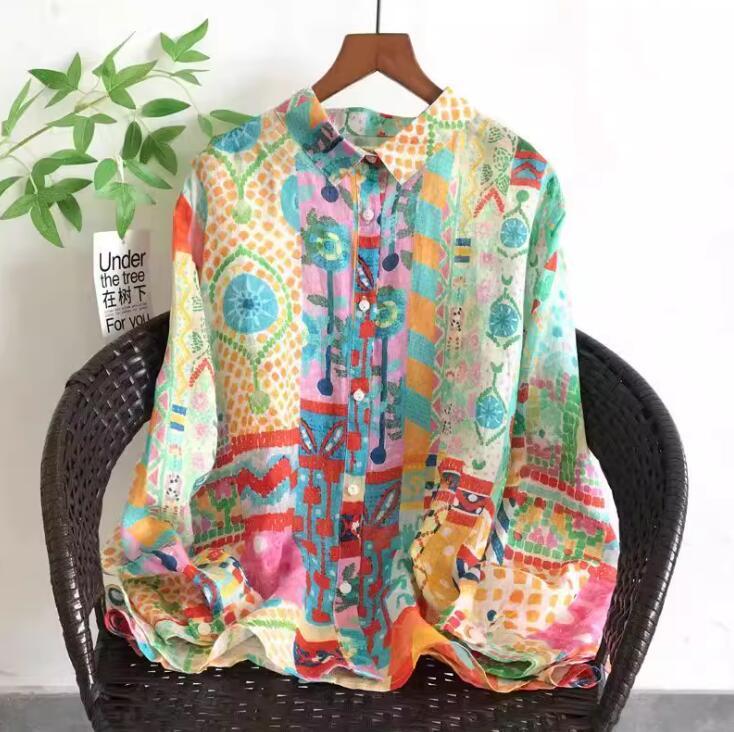 - 新入荷プリント花柄 フリーサイズ ワイシャツ チュニック トップス 麻100% 大人可愛 ナチュラル