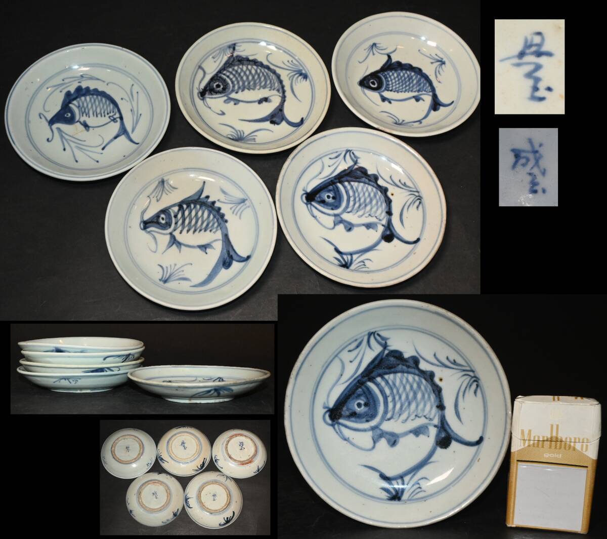> 中国美術 清朝時代 染付 魚図皿 5客 径約15.5cm 魚文 丸皿 小皿 茶道具 中国古玩 唐物 古美術