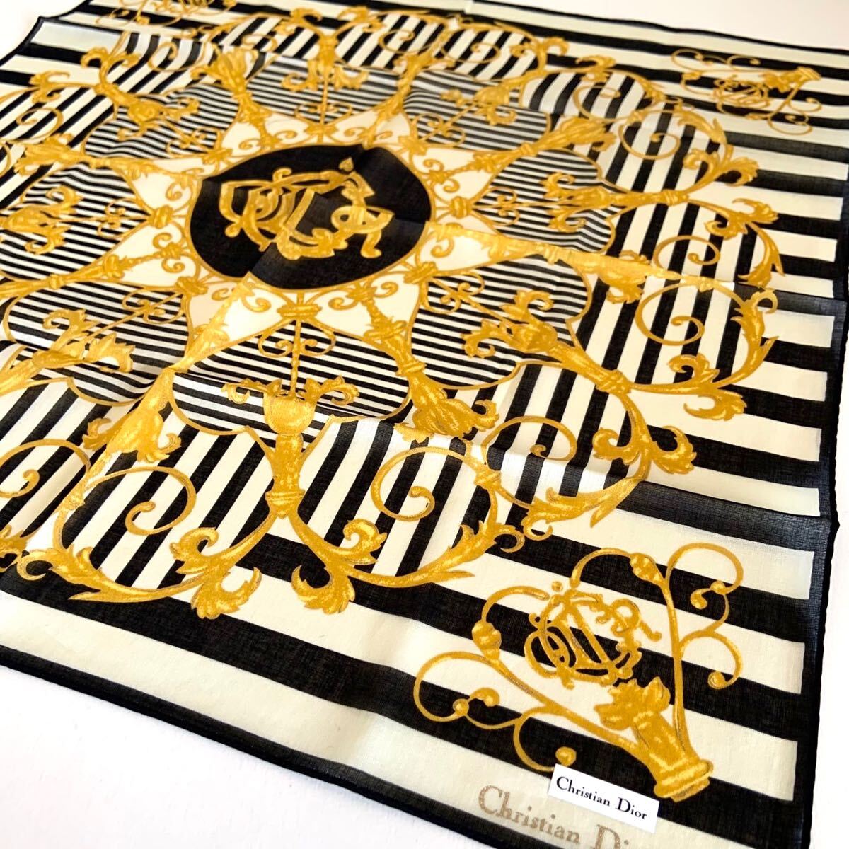 > 未使用 Christian Dior クリスチャンディオール 大判ハンカチ 約47.5×48cm 綿100% 総柄 ストライプ柄 ロゴ ハンカチ ミニスカーフ 鐘紡