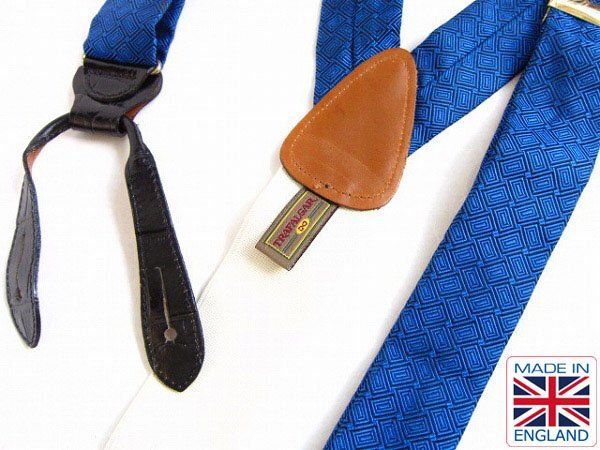> 高級品/英国製/トラファルガー/織柄×レザー/ボタンタブ式/Y型 サスペンダー/青系/メンズ/Yバック/ビジネス/スーツ/バンカー/D136