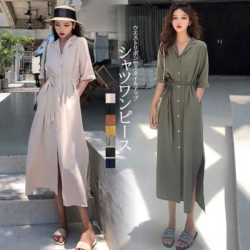 - レディース ワンピース 夏服 ロング丈 襟 ウエストリボン 羽織もの 大きめ(2XL) ダークグリーン