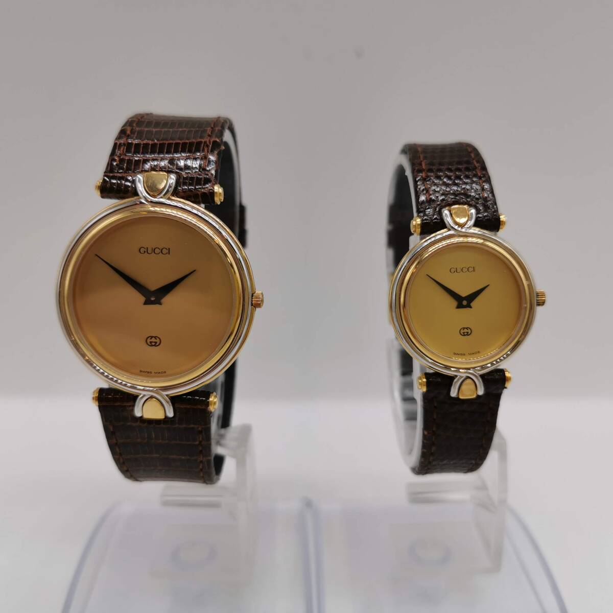 - 170811S64-0904S■GUCCI グッチ■4500M 4500L ペアウォッチ コンビカラー 茶革ベルト 腕時計 QZ メンズ レディース