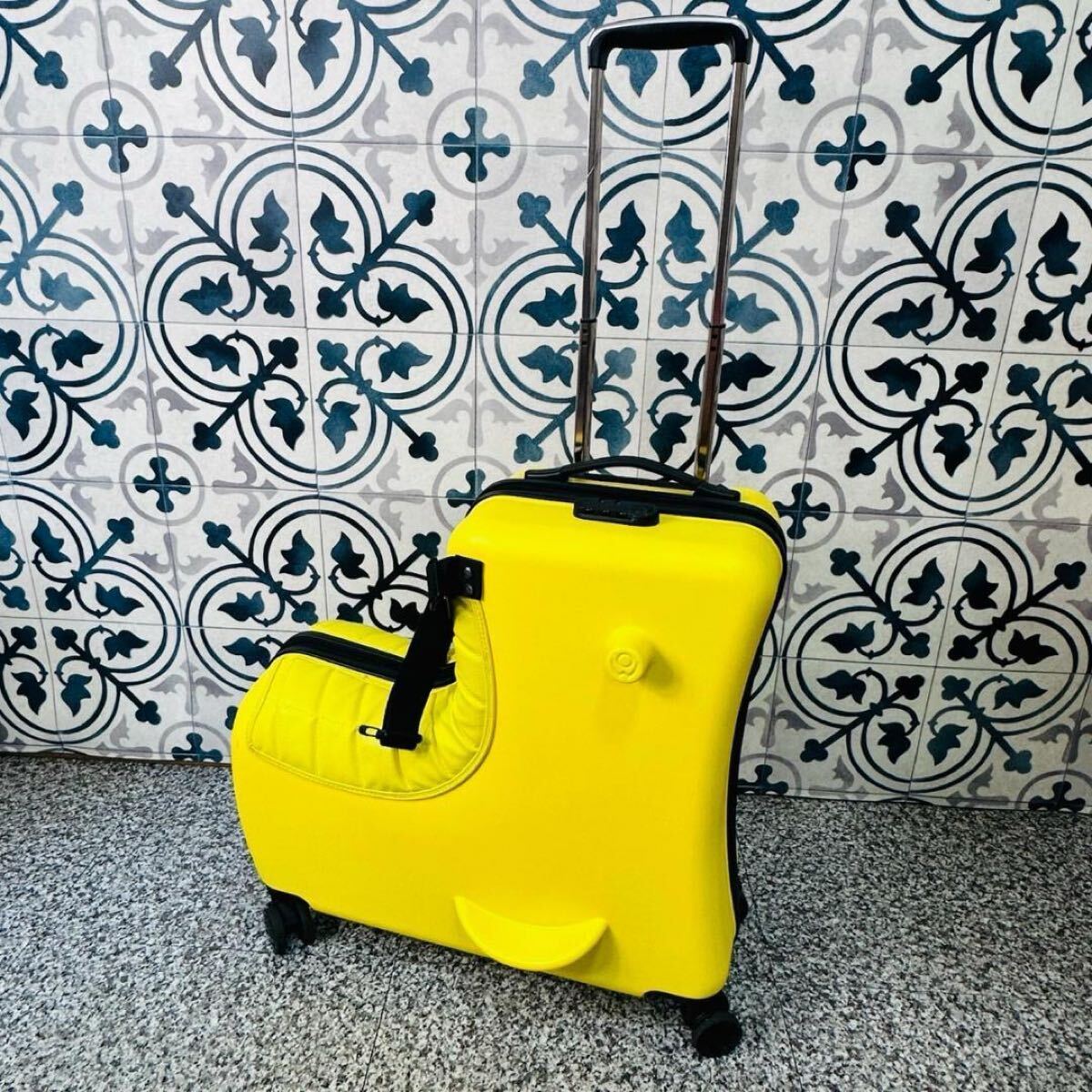 - 美品 キッズ トラベル 子供が乗れる キャリーケース ベルト パット付き イエロー 旅行バッグ スーツケース