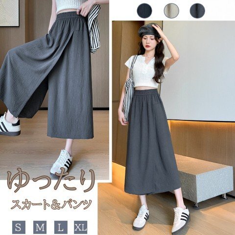 - パンツ スカートワイド ガウチョパンツ ボトムス レイヤード風 涼しい L グレー