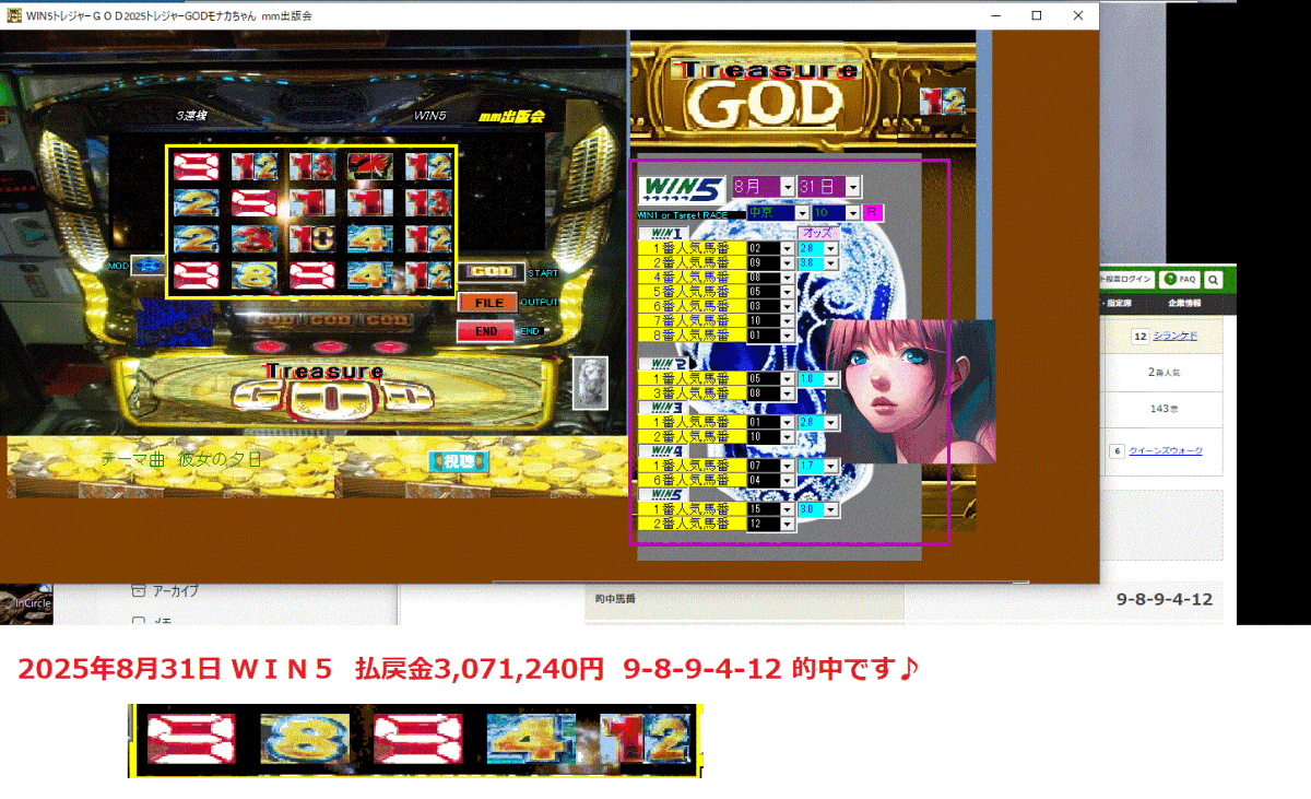 - 新作WIN5競馬ソフト『 WIN5トレジャーGOD2025トレジャーGODモナカちゃん 』2025年8月31日 払戻金3,071,240円的中!