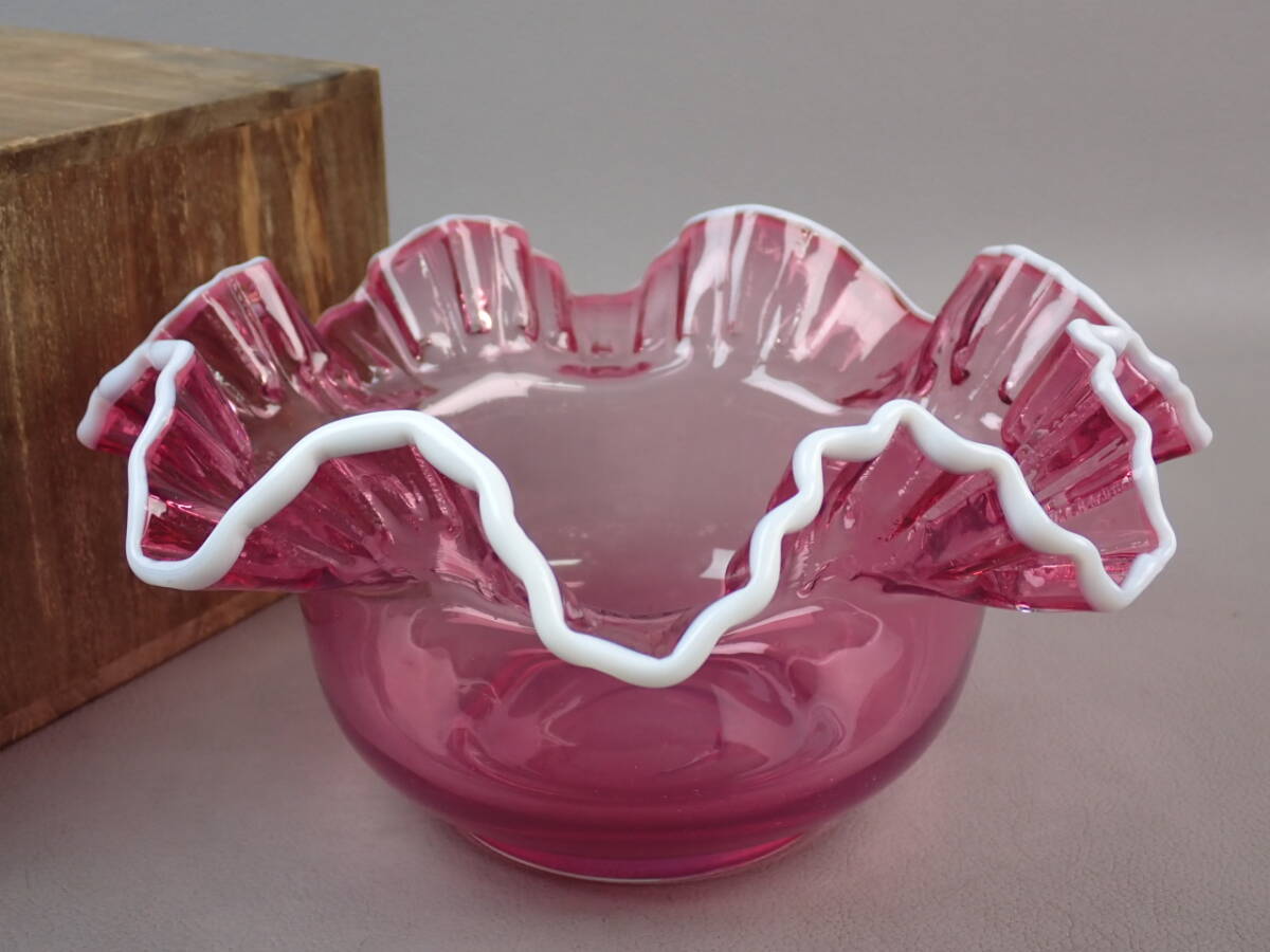 - 【骨董・茶道具】★古い ガラス★★縁白赤フリル鉢 go024sl 菓子器 氷コップ レトロ ガラス細工 和食器