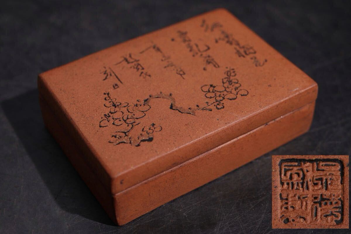 > 呉徳盛製 底款 朱泥 梅花 ・ 漢詩彫 香合 / 中国美術 香道具 茶器 煎茶道具 検索: 紫砂 紫泥 白泥 .G2476