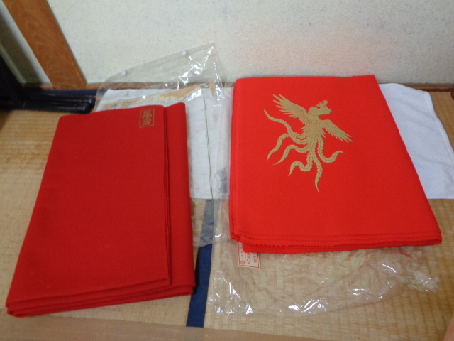 - 緋毛氈 2枚まとめて-萬壽毛氈・御結納毛氈/萬壽(濃い赤色):180cm×90cm・御結納毛氈(朱の鮮やかな方):180cm×140cm/未使用に近い美品