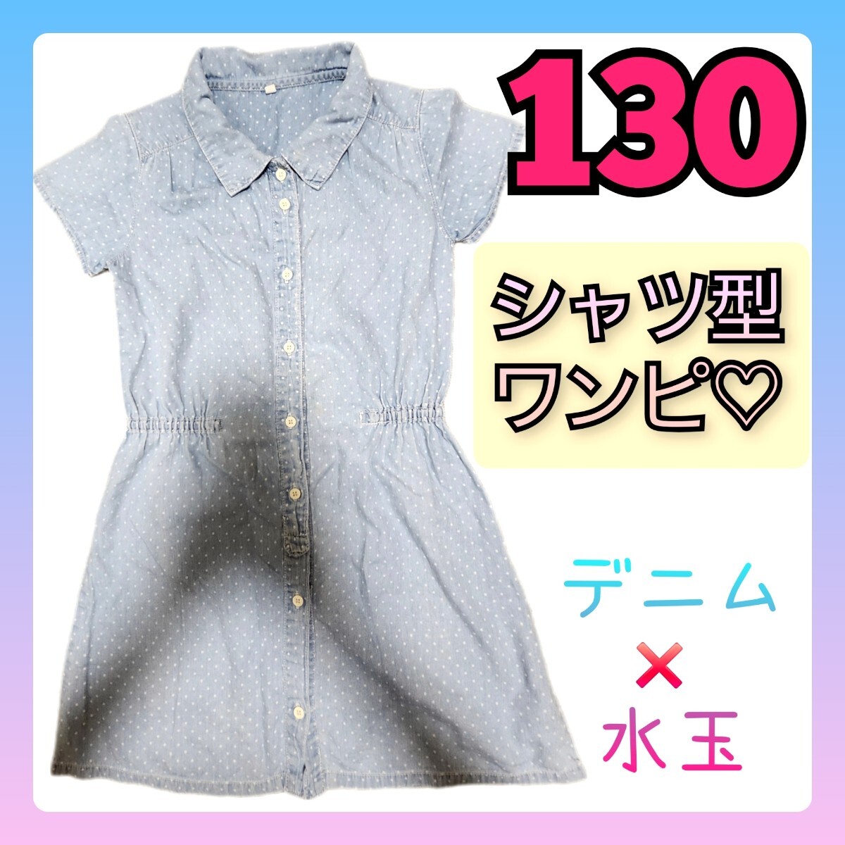 > 130 デニム 水玉 ドット 襟付き ワンピース ワンピ シャツワンピ 水色 半袖 夏服 秋服 キッズ コギャル 女の子 スカート