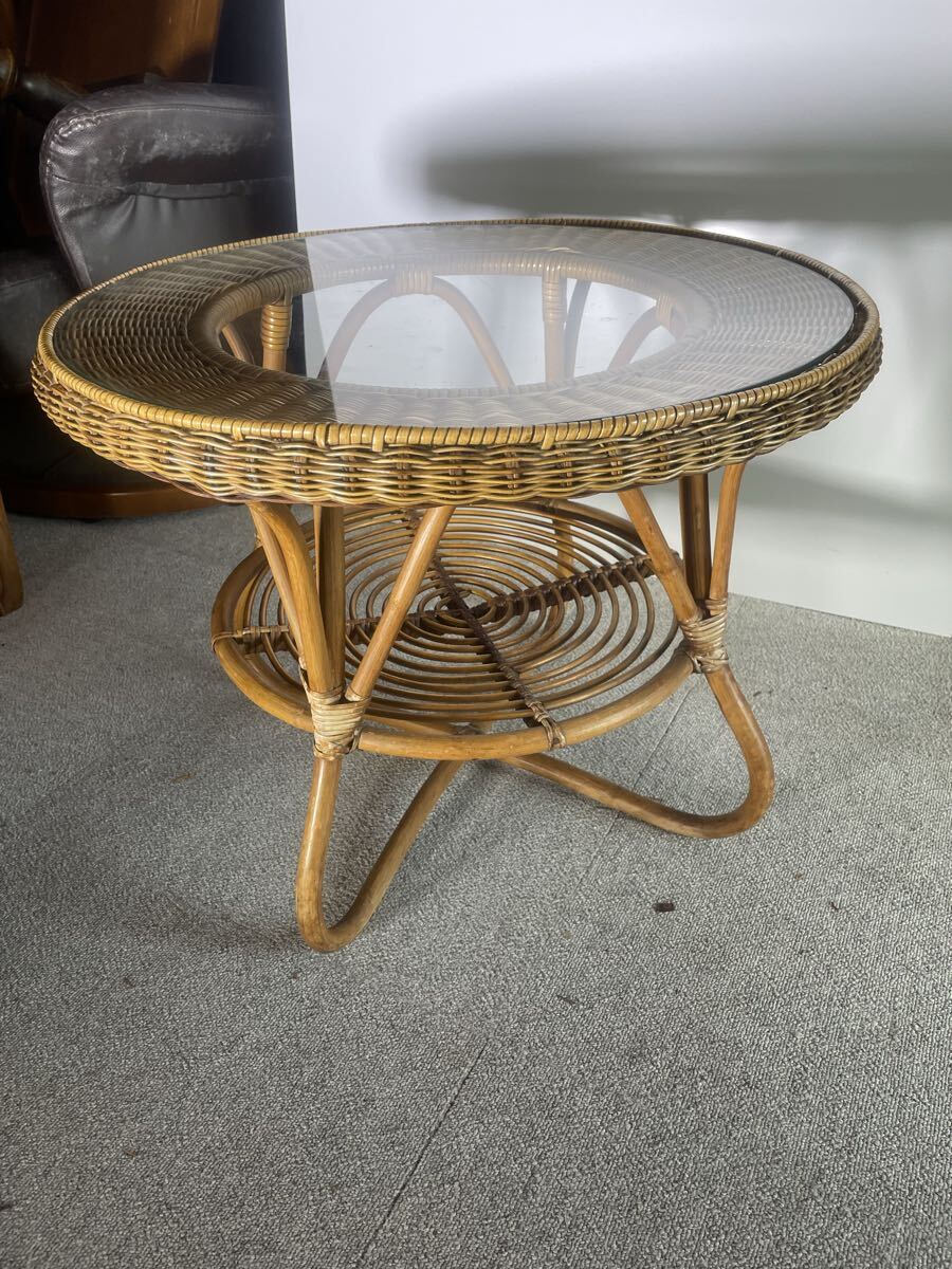 - 高級ラタン 丸テーブル ガラス天板 籐家具 サイドテーブル 昭和レトロ ビンテージ アンティーク