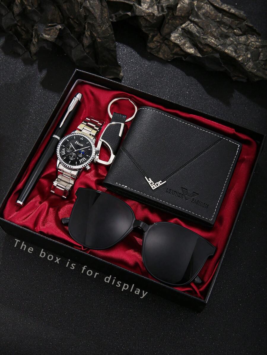 > 腕時計 メンズ セット ファッションビジネス クォーツ 腕時計、レザー 財布、キーチェーン、ボールペン、サングラス - メンズギフ