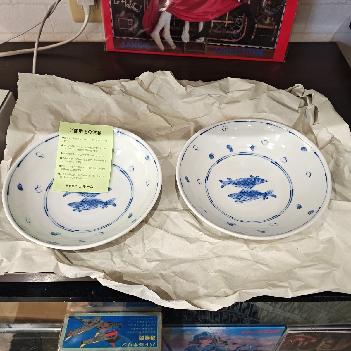 - 90718 日本古風堂 美濃焼 絵皿 中皿 染付双魚紋 風花 2客