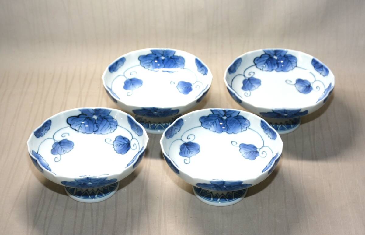 > 25◆初荷です ◆平戸焼 三川内焼 啓祥窯 染付蔦絵高台向付 4客 13.3cm ◆料理に使いやすいサイズです 高級和食器 懐石