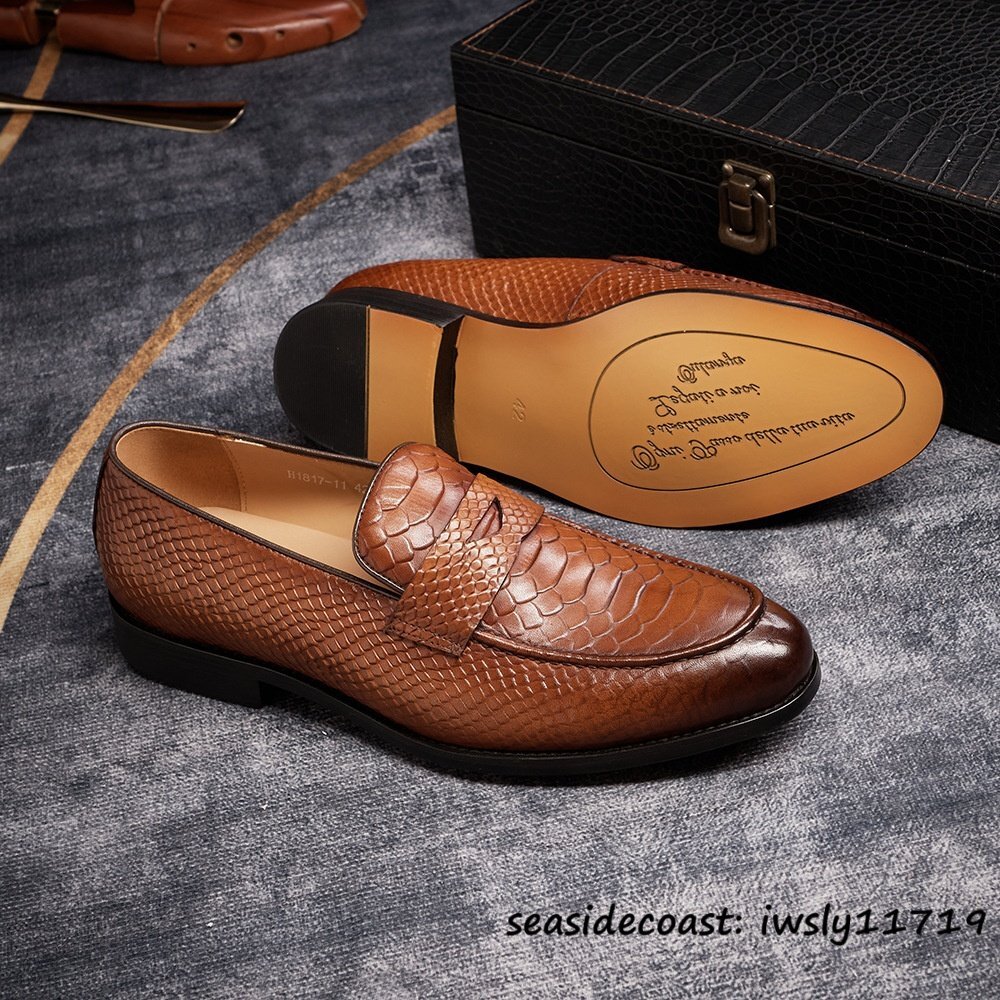 - 極美品★本革 鰐柄 スリッポン ローファー 職人手作り 高級牛革 レザーシューズ メンズ ビジネスシューズ ドレス 結婚式 ブラウン 25.5cm