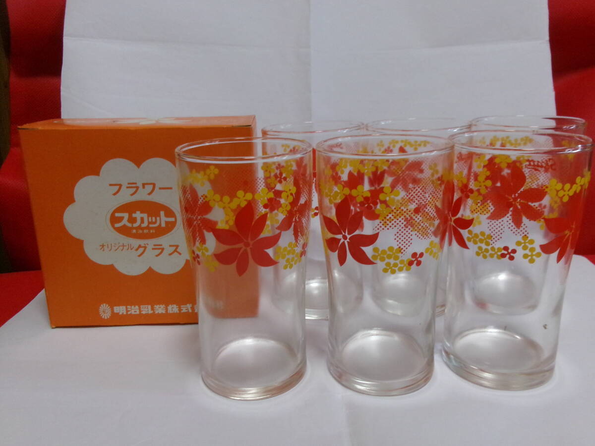 - 未使用品 レトロ 明治乳業スカット 花柄 グラス タンブラー 6個セット