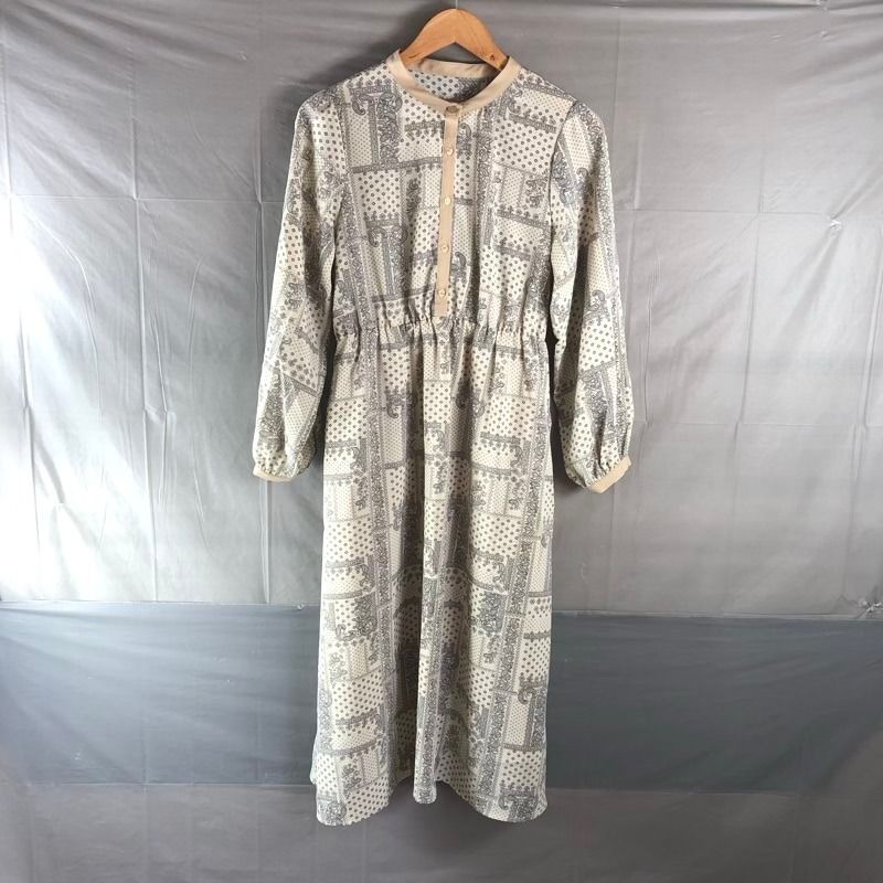 > ワンピース ロング 長袖 ペイズリー柄 ウエストゴム ギャザー 裏地付き ベージュ系 Mサイズ 2025082700127