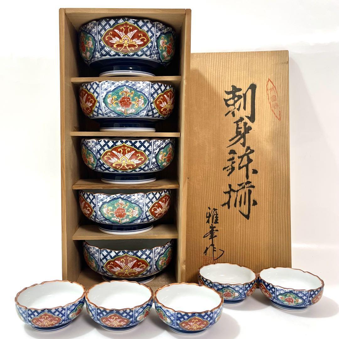 > そ9【共箱付き】雅峯作 有田焼 刺身皿 醤油皿ペア 5組揃 5客揃 木箱付 向付 本格和食器 料亭風 晩酌セット 吉祥文様 輪花口 先付け