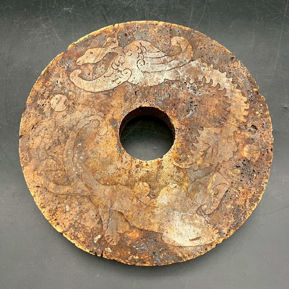 - SW0808-9‐3 古玉 古銭 玉 穴銭 玉璧 貨幣 硬貨 王朝 円盤 玉器 祭祀 儀礼 工芸 伝統 美術 模様 石 中国 直径17.5㎝ 60サイズ