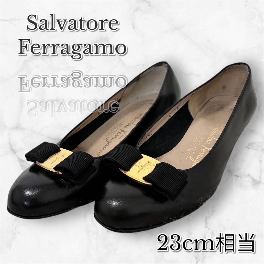 - FERRAGAMO フェラガモ パンプス ヒール 23cm 黒 リボン ヴァラ 4663 003421012