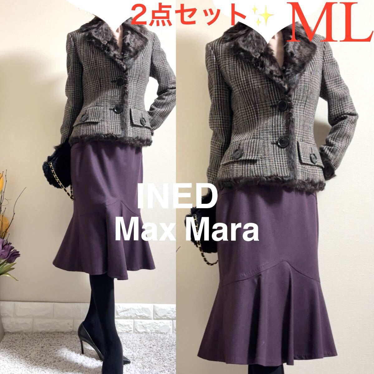 - MLスーツ!イネド ゴートファー ツイード 小顔 ボリュームファー ジャケット マックスマーラ Max Mara 美脚 マーメイドスカート 紫