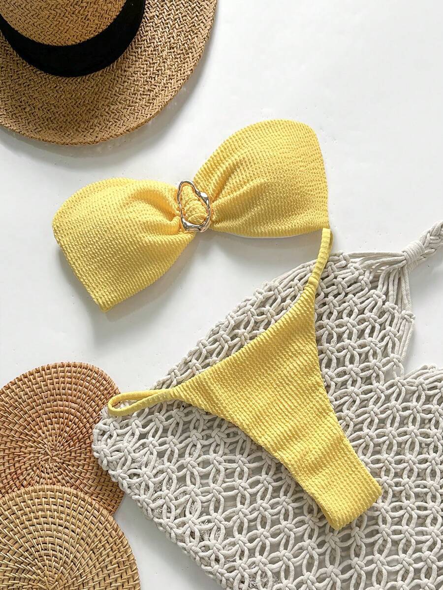 - レディース 水着 ビキニセット スプリングブレイク レディース 無地 ジャガード生地 ストラップレス メタリックデコレーション セ