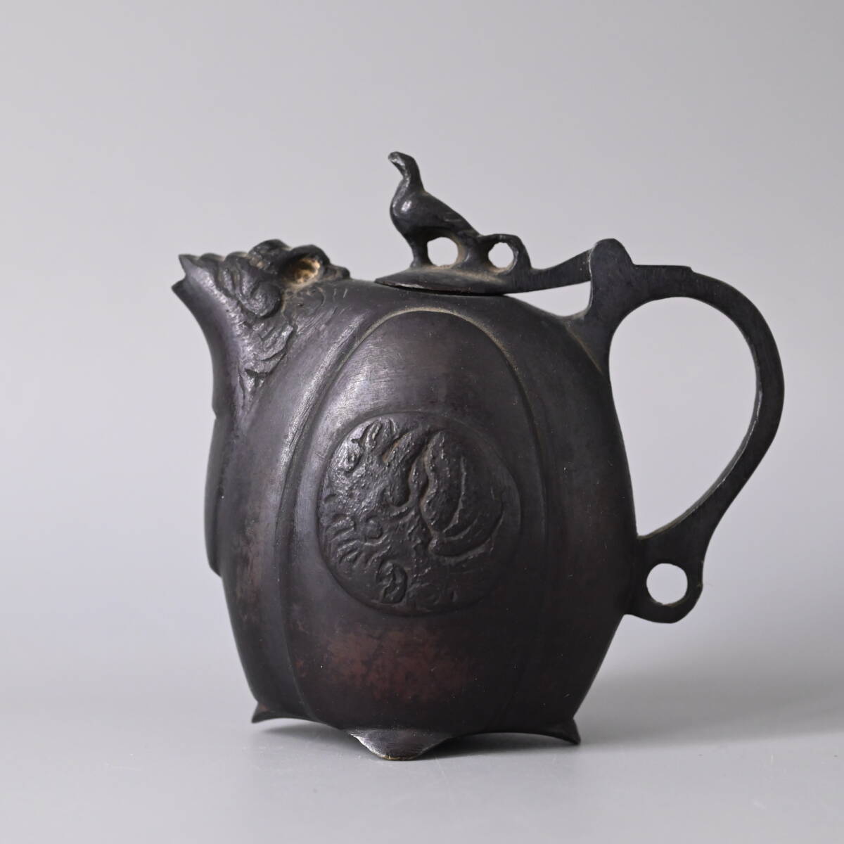 > 11061 時代 水滴 真鍮 鳳凰 羊 動物文 燭台 幅73mm 高70mm 厚38mm 書道具 文房四宝 骨董 古玩