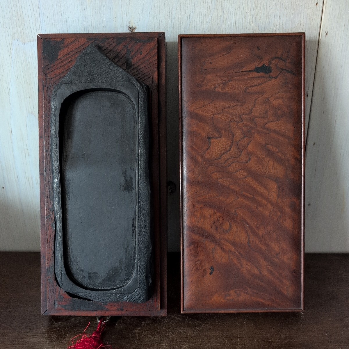 - ひらがな用 引き出し付 欅玉杢 硯箱 書道具 書道 自然石硯 雨畑硯?
