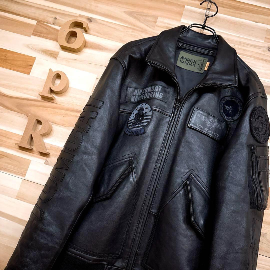 * CWU LEATHER TOP GUN / 6101057 *使い込むほどに革の風合いが出やすく味の出るベジタブル鞣しの上質な羊革を使用。スタンドカラーにもなる2wayの襟元にフライトジャケットの特徴であるアームポケット。左袖にキャンペーンのアイコンパッチ、その他、ボディー全体に「TOP GUN/トップガン」をモチーフにしたマルチロゴをレイアウト。その全てをブラック系統で統一した武骨で男らしさのあふれるAVIREXのジャケットです。発売後、瞬く間に完売となった「オールブラック」モデル。既に生産も終了している廃番モデルで今では、オークションやフリマでも滅多に見ることがなく入手困難となっている超激レアなアイテムです。