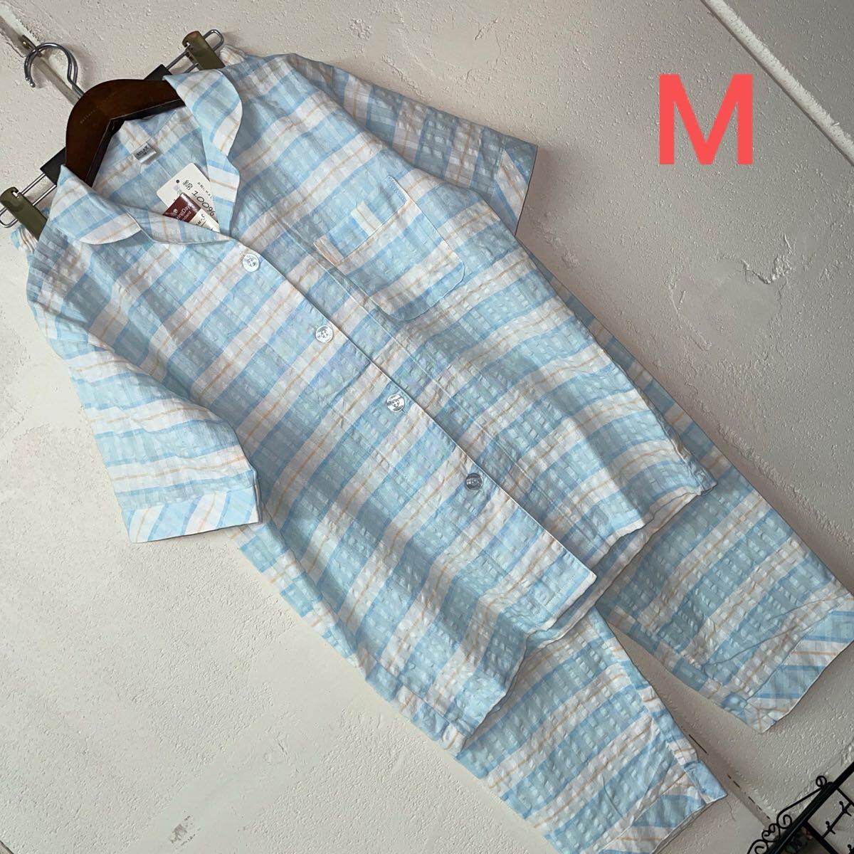 - Mサイズ綿100%サッカー素材半袖長ズボンパジャマ上下セット ブルー