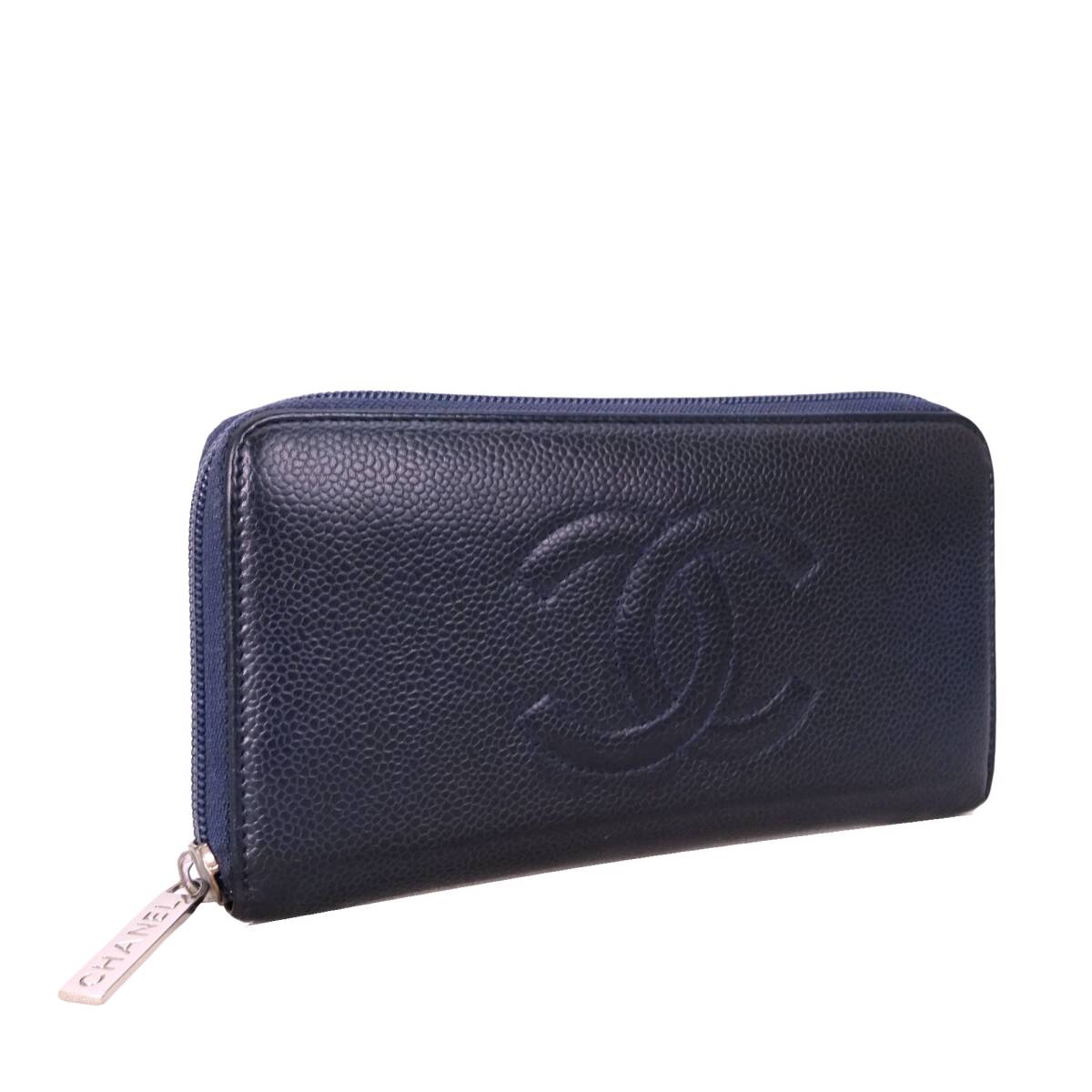 > 本物良品■シャネル■ココマーク キャビアスキン ネイビー レザー シルバー ラウンドファスナー長財布