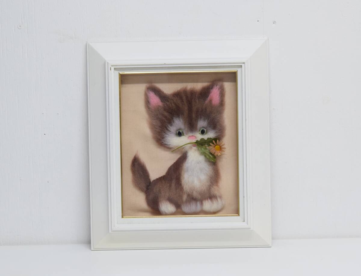 - ■ 昭和レトロ 羊毛フェルト 猫 額装品 花をくわえた子猫 ■