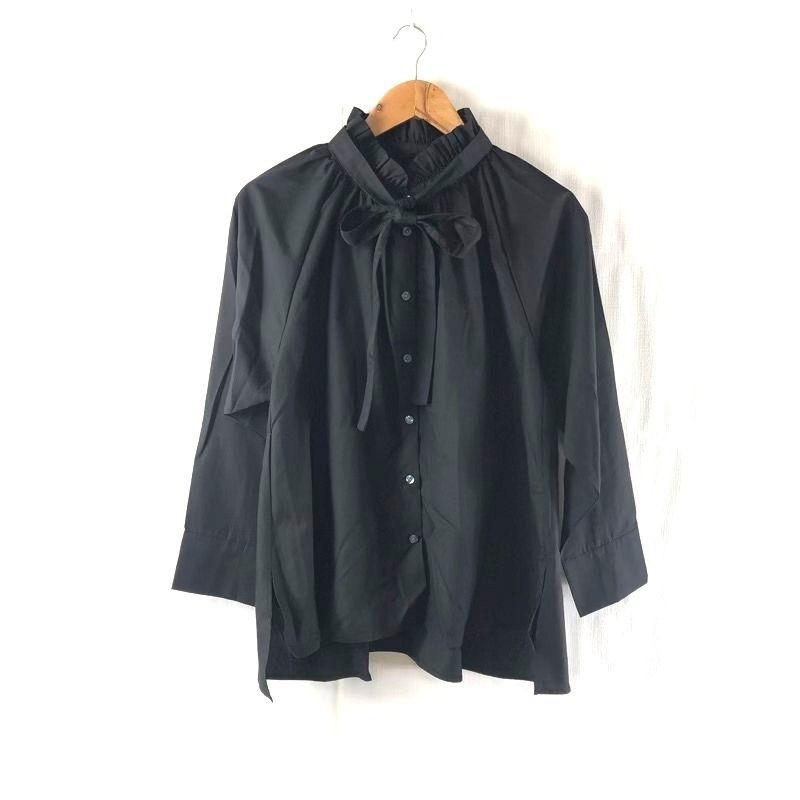 - M... カットソー 長袖 フリルネック リボン紐 スリット裾 ボタン タグ付き 黒 LLサイズ 2025082700172