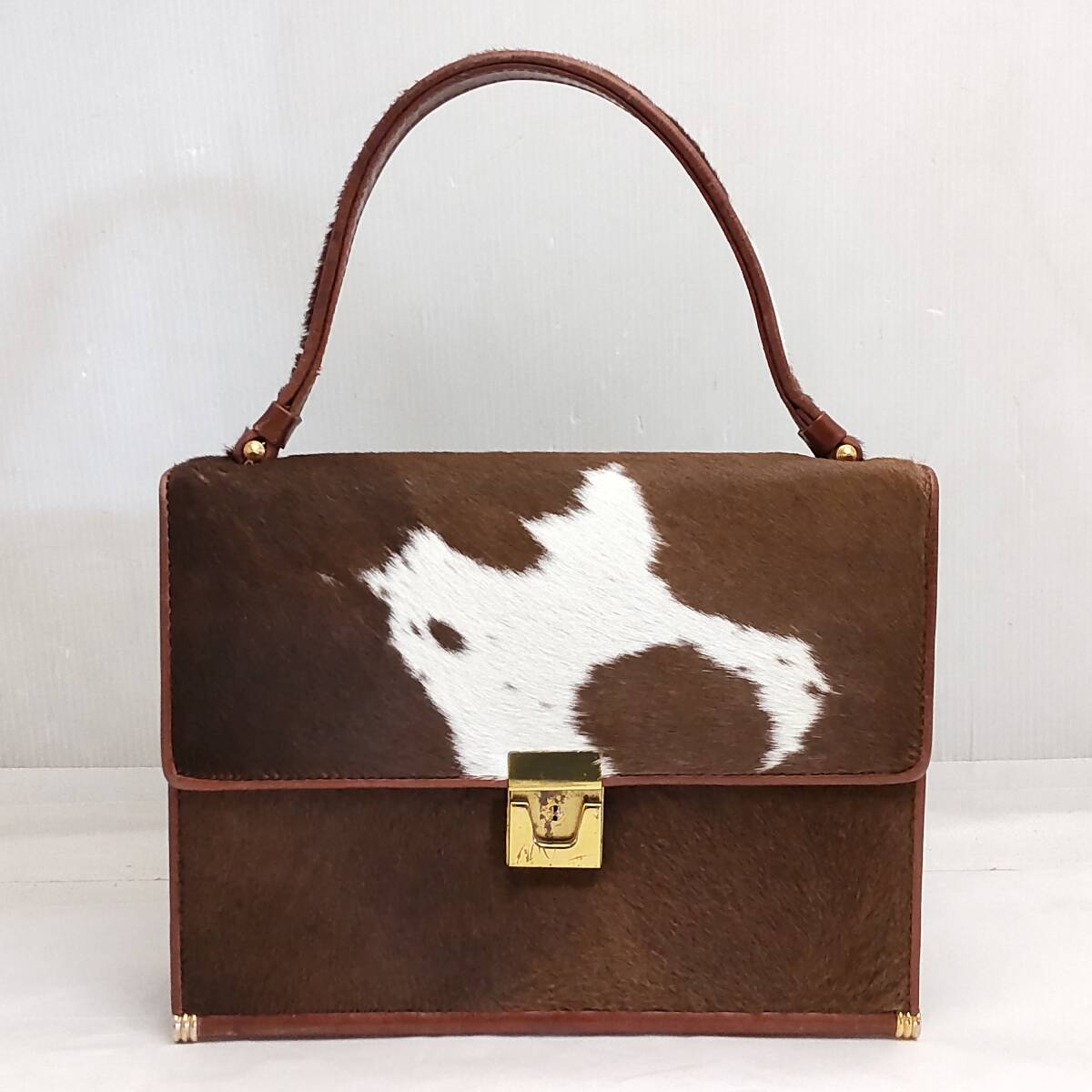 - Y091201■ハラコ ハンドバッグ 牛革 レザー 起毛 ウシ柄 ブラウン×ホワイト 幅約24cm 高さ約18cm マチ約4~14cm キー欠品■