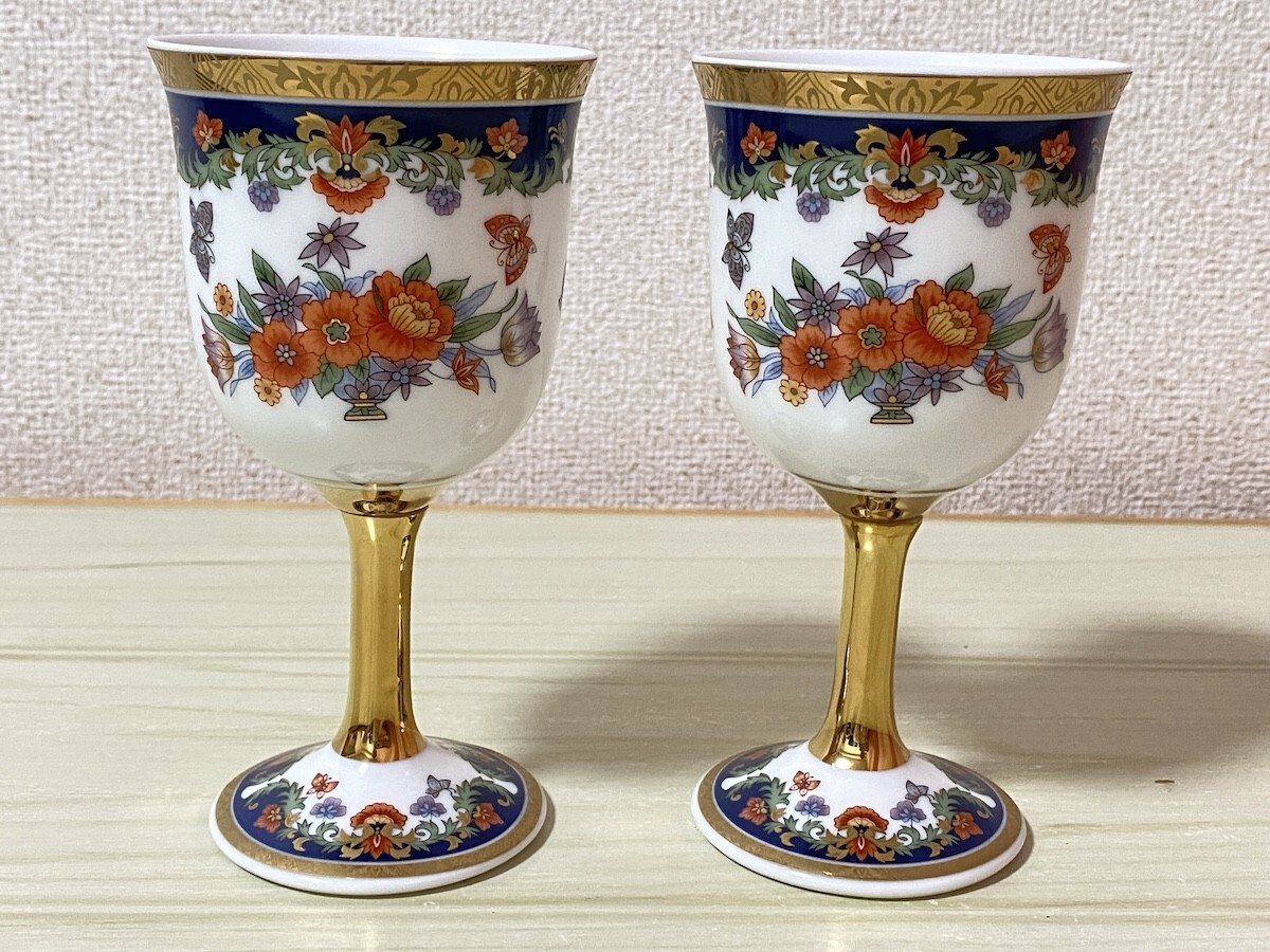 > 【KB141】AZABU TATSUMI My Life ペア ワイングラス 磁器 金彩花色絵 直径約7cm 高さ約14cm 陶磁器 酒器 洋食器
