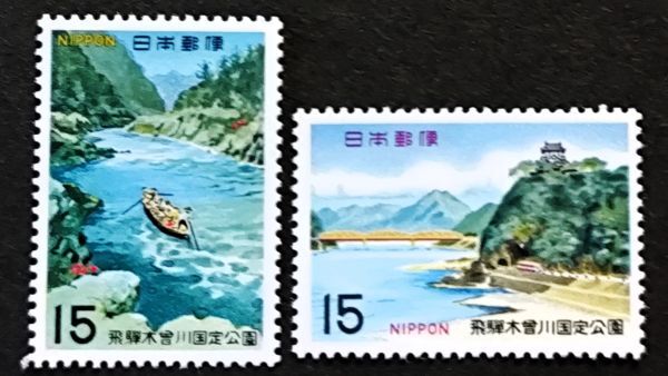 - [25091108]【国定公園 飛騨木曾川】単片2種「木曾川・犬山城と木曾川」15円×2 1968年発行 美品