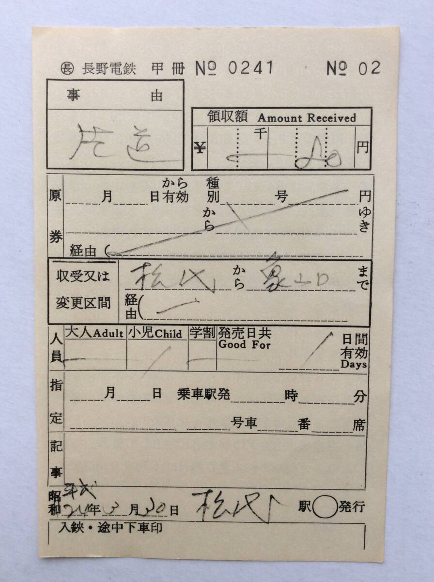 - 長野電鉄 屋代線 出補 片道乗車券 松代→象山口 松代駅発行 平成24年3月30日 廃止路線 出札補充券