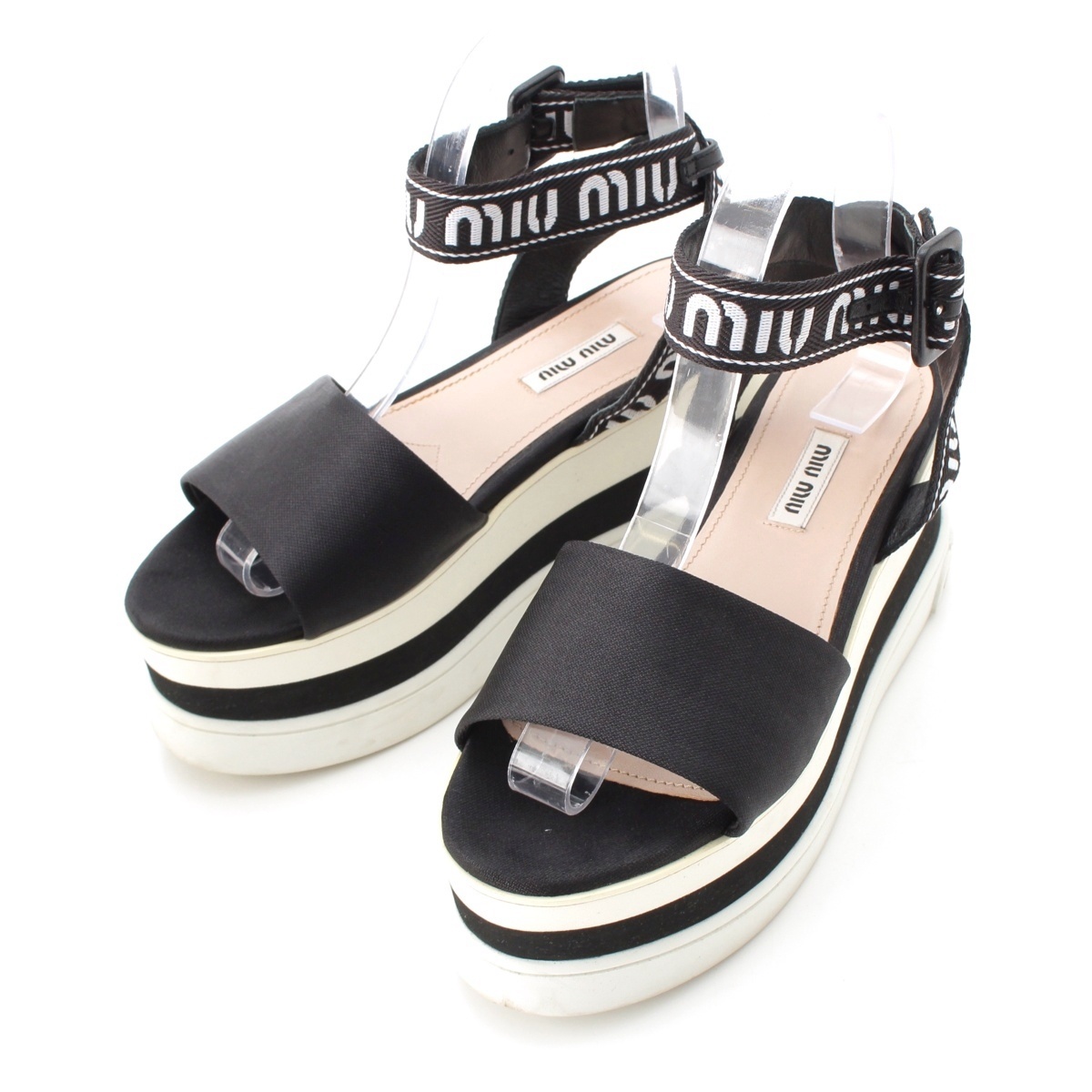 - ミュウミュウ ファブリック プラットフォーム 厚底 ロゴ ストラップ サンダル ブラック 37【中古】