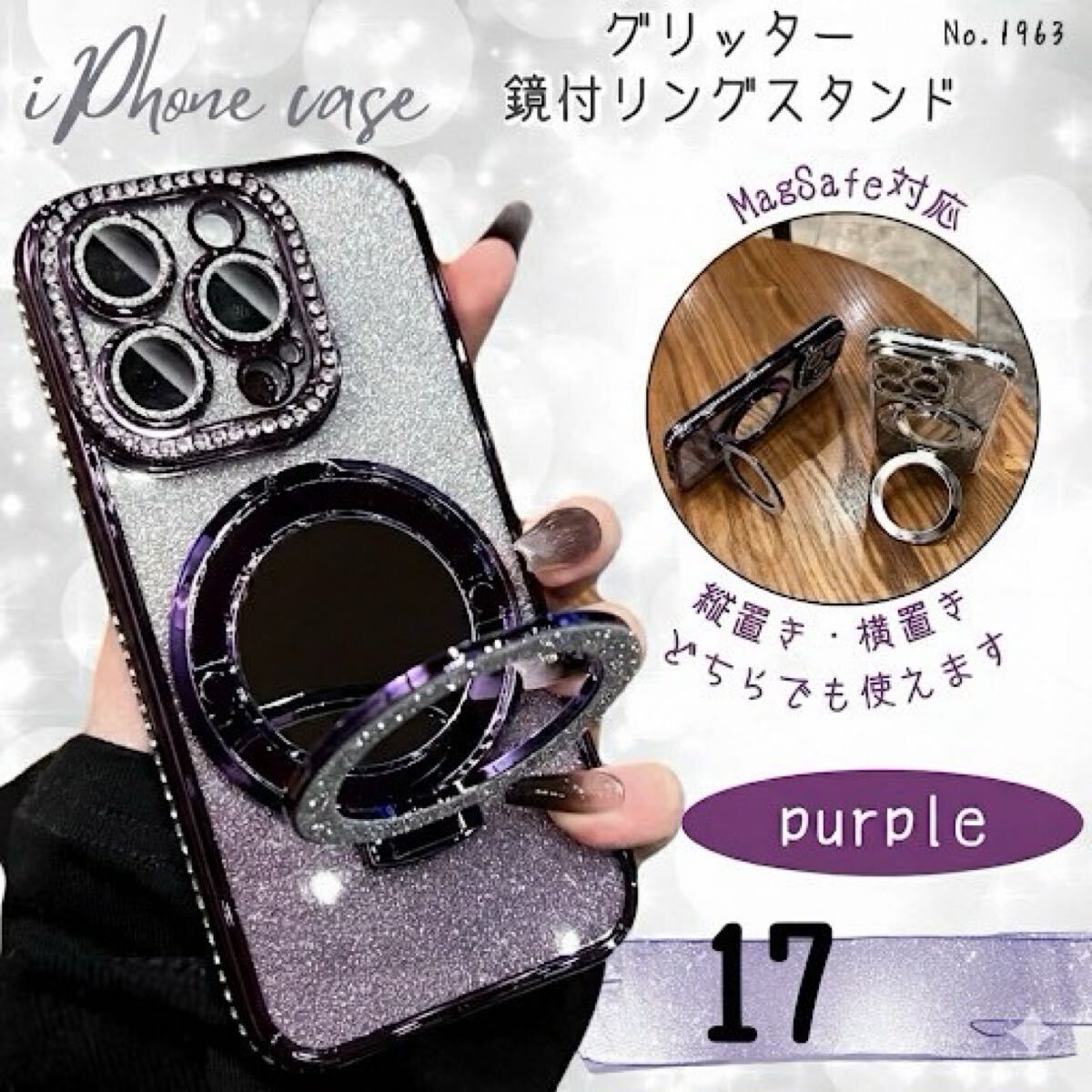 - 新品!グリッター 鏡付 リングスタンド iPhone17ケース パープル ラメ
