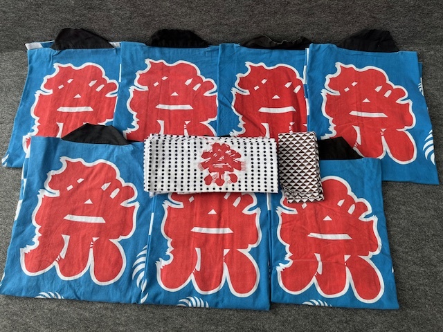 - <送料込>サイズ違い まとめて7着セット 大人用 祭 法被 はっぴ お祭り 青 はんてん 御祭礼/着丈70㎝ 肩幅65㎝ ハチマキ 帯付き 中古品