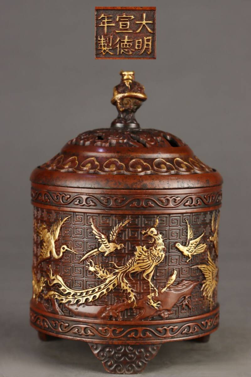 - 永し 明時代 大明宣德年製 紫銅塗金 百鳥朝鳳紋筒式爐 極細工 古銅彫 置物擺件 古美術品 時代物 古董品 収集 古美味 旧家蔵出 中国唐物 A1