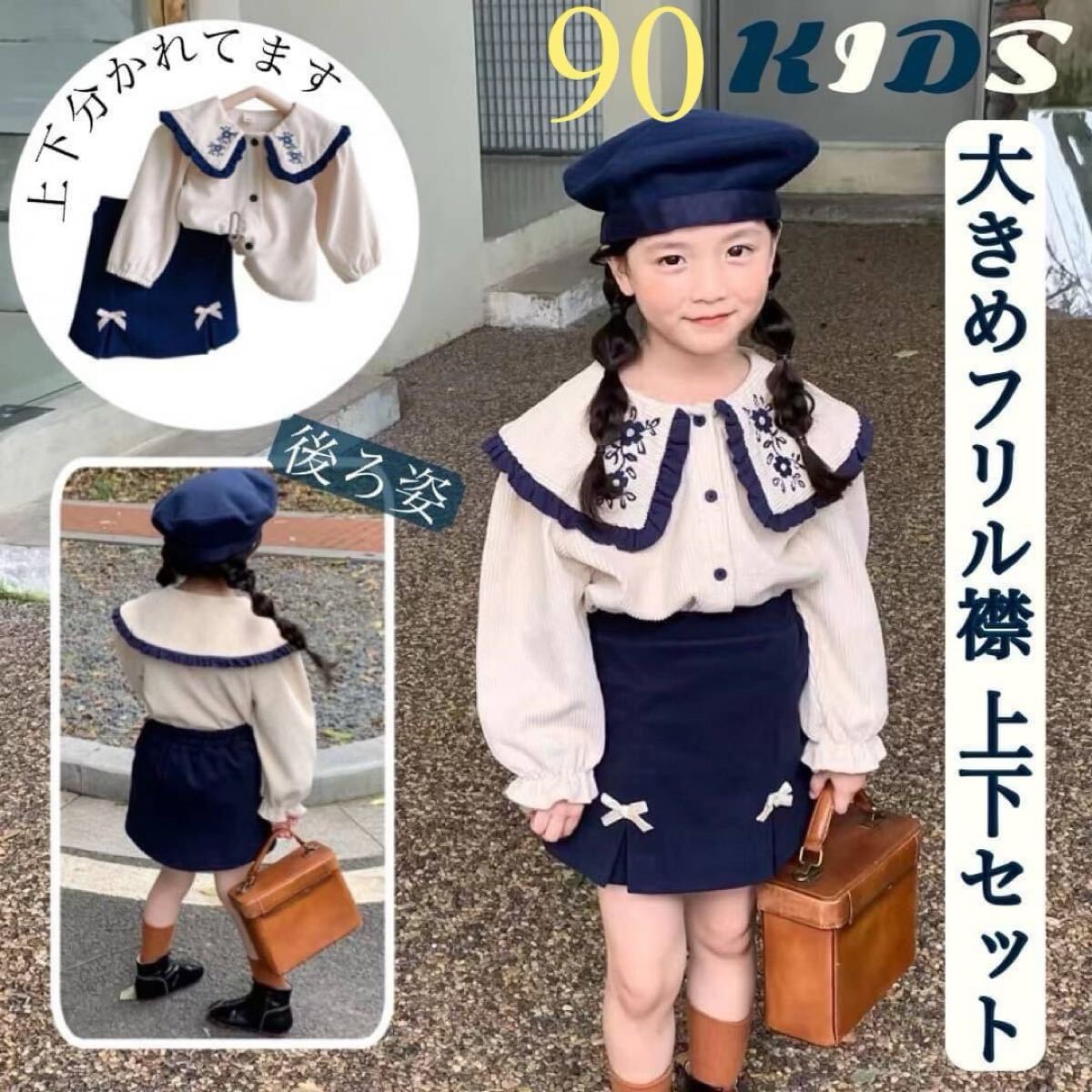 > 新品!キッズ 大きめフリル襟 上下セット 90 トップス スカート風ズボン 女の子 お呼ばれ 入園式