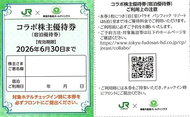 - JR東日本 東急不動産HDコラボ株主優待券 宿泊優待券 1枚(単位) ~5枚迄 2026年6月末迄有効