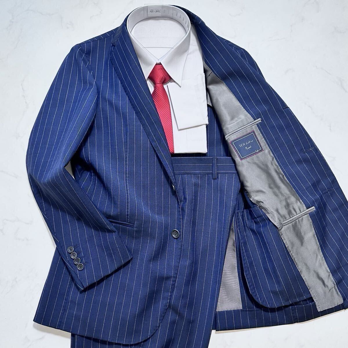 - 極美品◎Stile Latino 最高級モヘヤ セットアップ ビジネススーツ ストライプ 背抜き 本切羽 メンズ ネイビー紺 46 スティレラティーノ