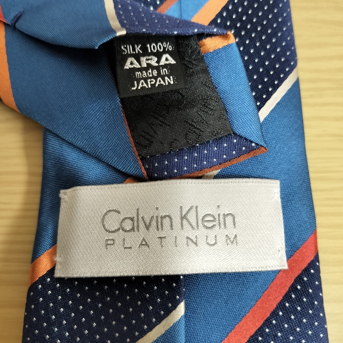 - カルバンクライン(Calvin Klein)青紺色オレンジ線線ストライプネクタイ