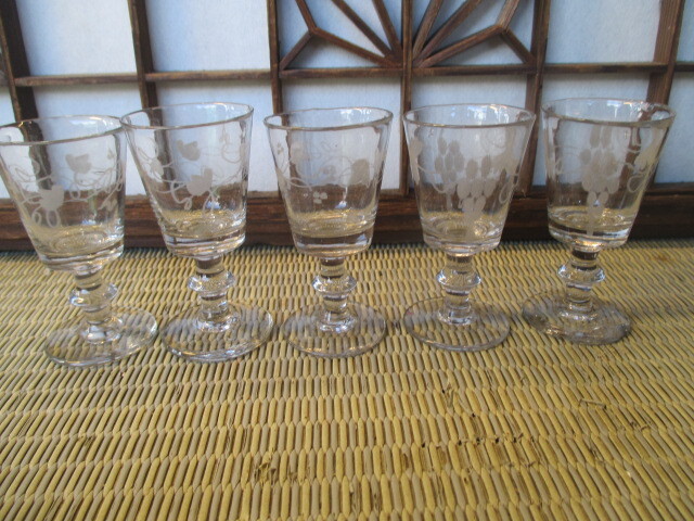 - 《和》アンティーク絵ガラス(葡萄) ショットグラス5客 リキュール 明治期