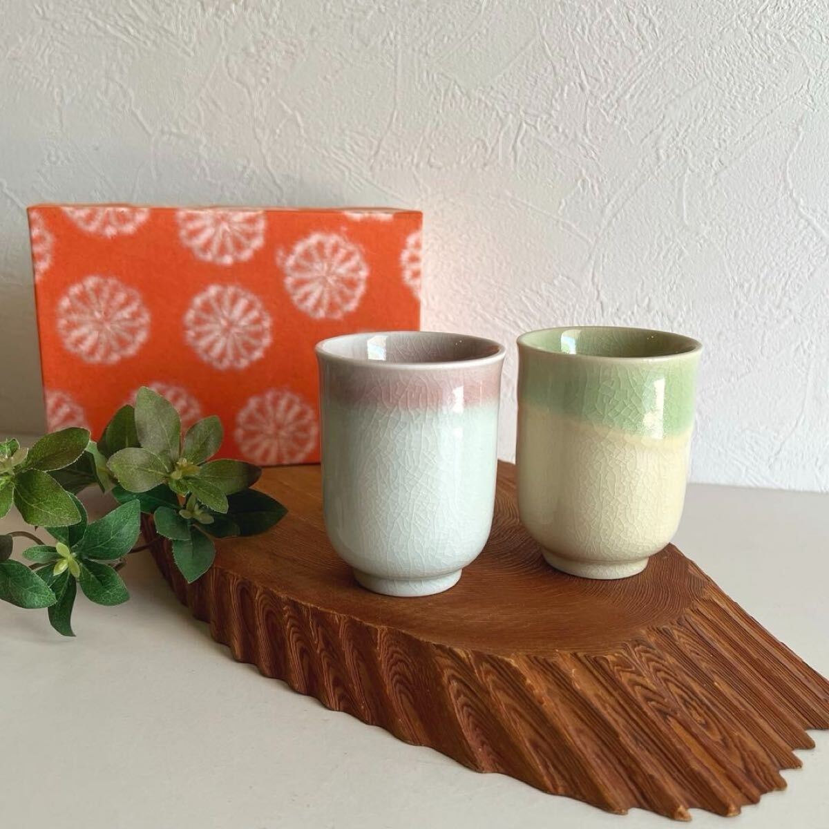 - wasabi k882 薩摩焼 錦正刻銘 貫入釉 夫婦湯飲み ペア湯飲み 桃色・若草色 箱入り 伝統工芸 白薩摩 ゆっくりとお茶の時間を楽しむ長湯飲み