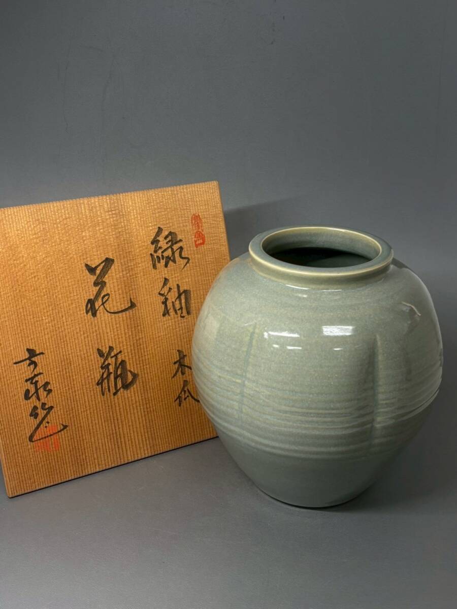 > 緑釉 木瓜 花瓶 作家物 骨董 置物 飾物 日本伝統工芸品 芸術 古美術 落款 花器 華道具 花入 茶道具 初出 長崎買取 在銘 時代物